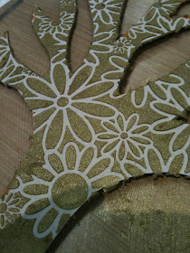 Now this piece above is one of the Pink and Orange ladies starting work on the canvas backing board. Look how scrumptious those colours of Inka Gold looks through a stencil! I was soooo excited by this!