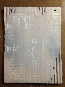 Before painting my base layer, I wanted to add some texture with Grunge Paste which is a super fine, fast drying paste. I chose a stencil that is in keeping with my botanical theme and when the piece is finished, this layer will appear to be a middle layer so it's kind of important to choose wisely. I only wanted to use one of the flowers on this stencil as they are quite close together.