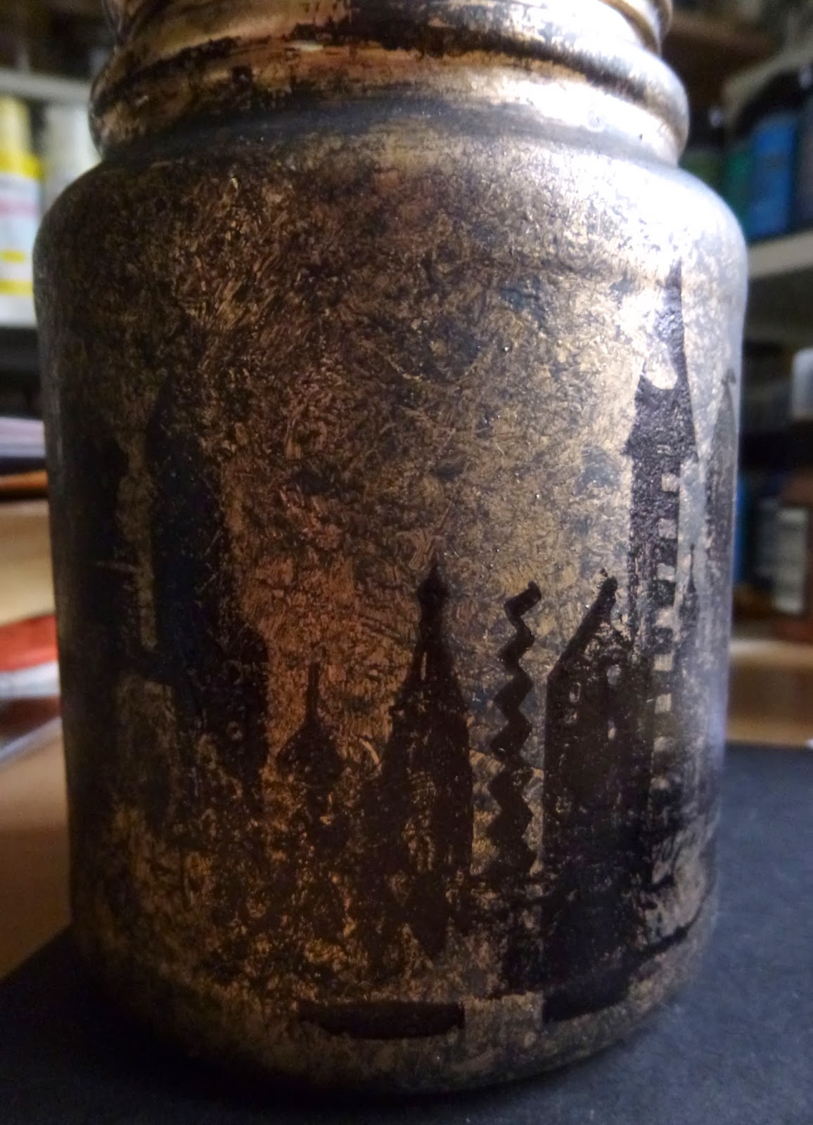 First up, an experiment that's ended up pleasing me quite a lot. I didn't really have much of a plan when I set off - other than using some Lynne Perella stamps and doing something with a jar... that was about it.