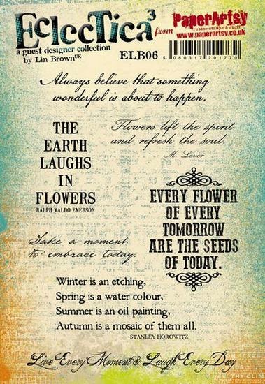 The face from HP1303 and the words from ELB 06 were stamped onto some painted card. I then painted a little colour onto the face and glazed a little blue