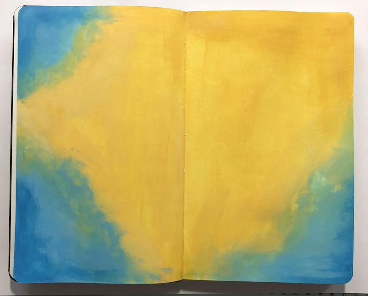 I started with gessoed pages and painted them, partly with PaperArtsy Fresco Finish Chalk Acrylics in Mustard Pickle and partly with Smurf. I did add some China along the Smurf edges to edge it a little.