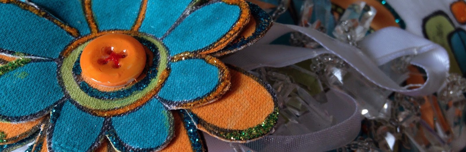 I stamped the flower from EKD06 three times onto white cotton and stuck this onto Grunge paper. Once coloured I layered the images up to make my embellishment. I did not have a small orange button so I painted a white one with Tango Paint to match.