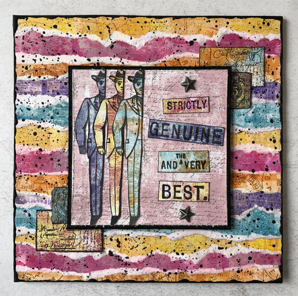 Brilliant work with these gorgeous new stamps, Nikki - I love the contrasting colour layers in the postmark panels (oh, those postmark collages!), and the dapper line up of chaps is very cool.