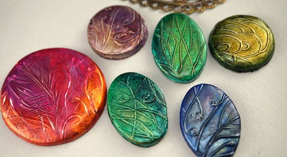 To begin our mica meanderings, I've found a PaperArtsy post I'd not seen before, and it perfectly encapsulates how beautiful mica products can be. Lin Brown has used Mica powders directly onto polymer clay stamped with her own images and it simply shines!