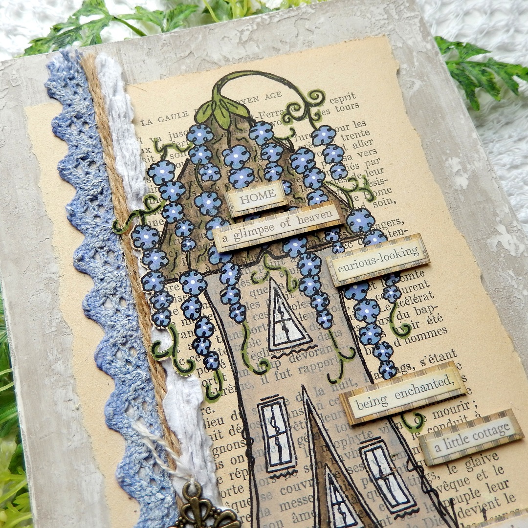 This gorgeous Cottage is dripping with pretty flowers, perfectly summery! Jenny has come up with great 'line' ideas embedded in the background too! And the little key embellishment is perfect! Frescos and stamps combine with serene harmony for this delightful creation.