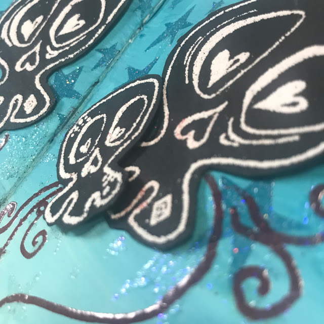 Bone Daddy is actually a 'mer-cat' out for a swim with his helium filled balloons. (Just to show you that you do not have to be dark and spooky to enjoy these Halloween themed goodies.)