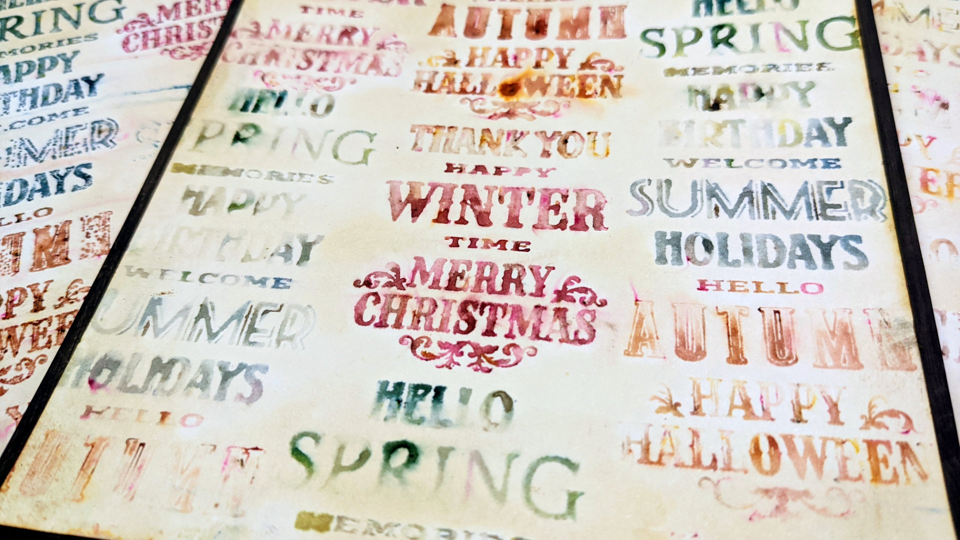 In this case I selected the column of sentiments and used it directly to create a pattern, like a word cloud. Then I used Infusions golden sands and some Vintage Photo Distress ink to create this coloured and textured background.