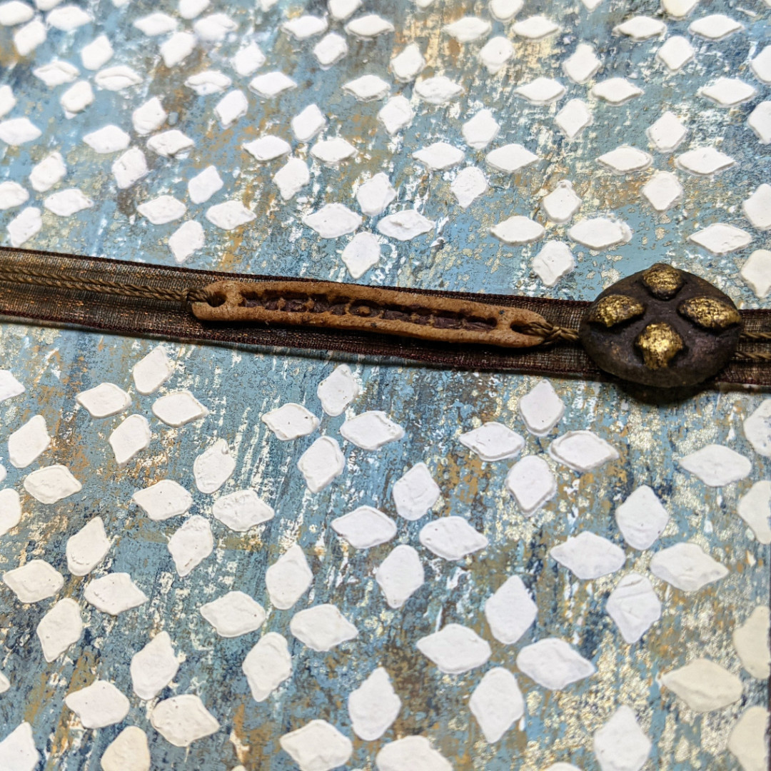 Then I thought that a ribbon on its own would be too boring, so I took my quick cure clay and stamped the word Memories from ESC29 on it and coloured it with inks and infusions. I also did like a button using the biggest circle on PS294 and one of the same pattern flowers for the centre which I embossed with Luxurious chocolate.