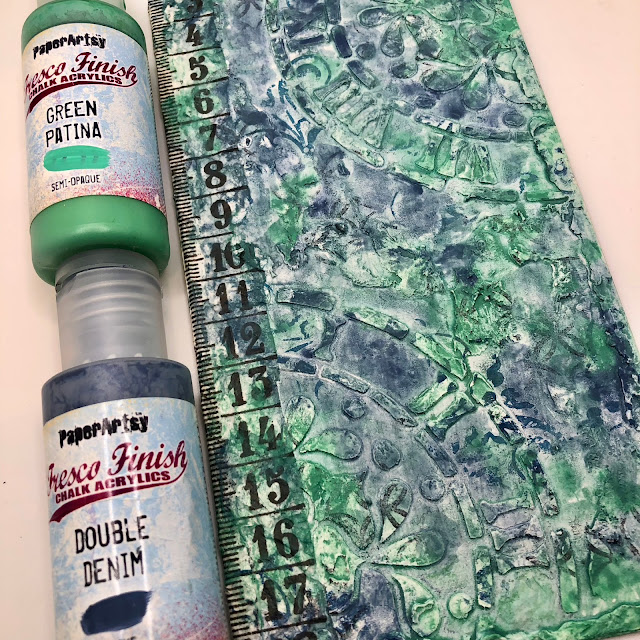 The numbers are from PaperArtsy Printed Tissue (PT02) and you might be able to see some random stamping in the background too. Once all this was dry I added watered down paint in two colours before heat drying. I used PaperArtsy Fresco Finish Chalk Acrylic - Green Patina (FF126) and Double Denim (FF128).