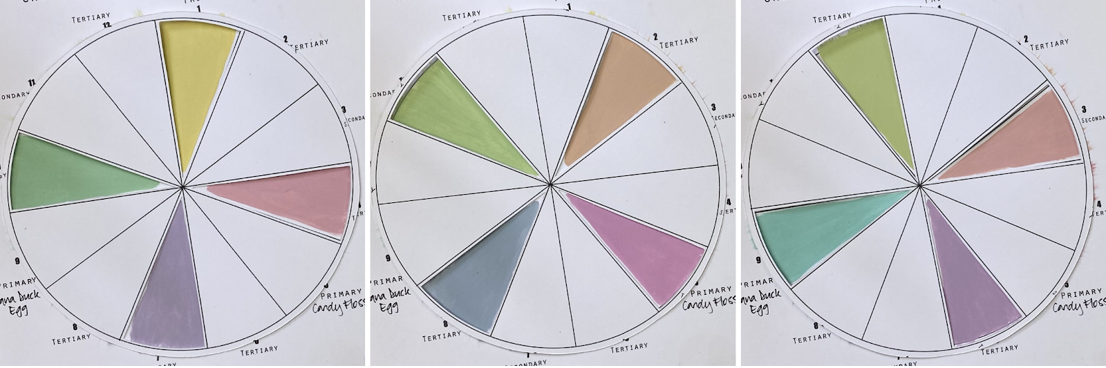 Using Fresco Finish Acrylic Paints in Butter, Candy Floss and Aqua Duck Egg as our starting colours, we have built for you a summer-loving wheel, of ice-cream-ish colours.