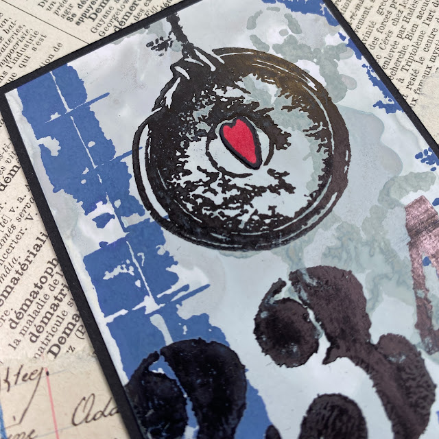 To make sure the little heart would stand out, I stamped it on red paper, trimmed it and glued it over the stamped heart on the ATC. This way, it keeps its striking red color. Using the bright blue for the background stamp emphasizes the red heart.