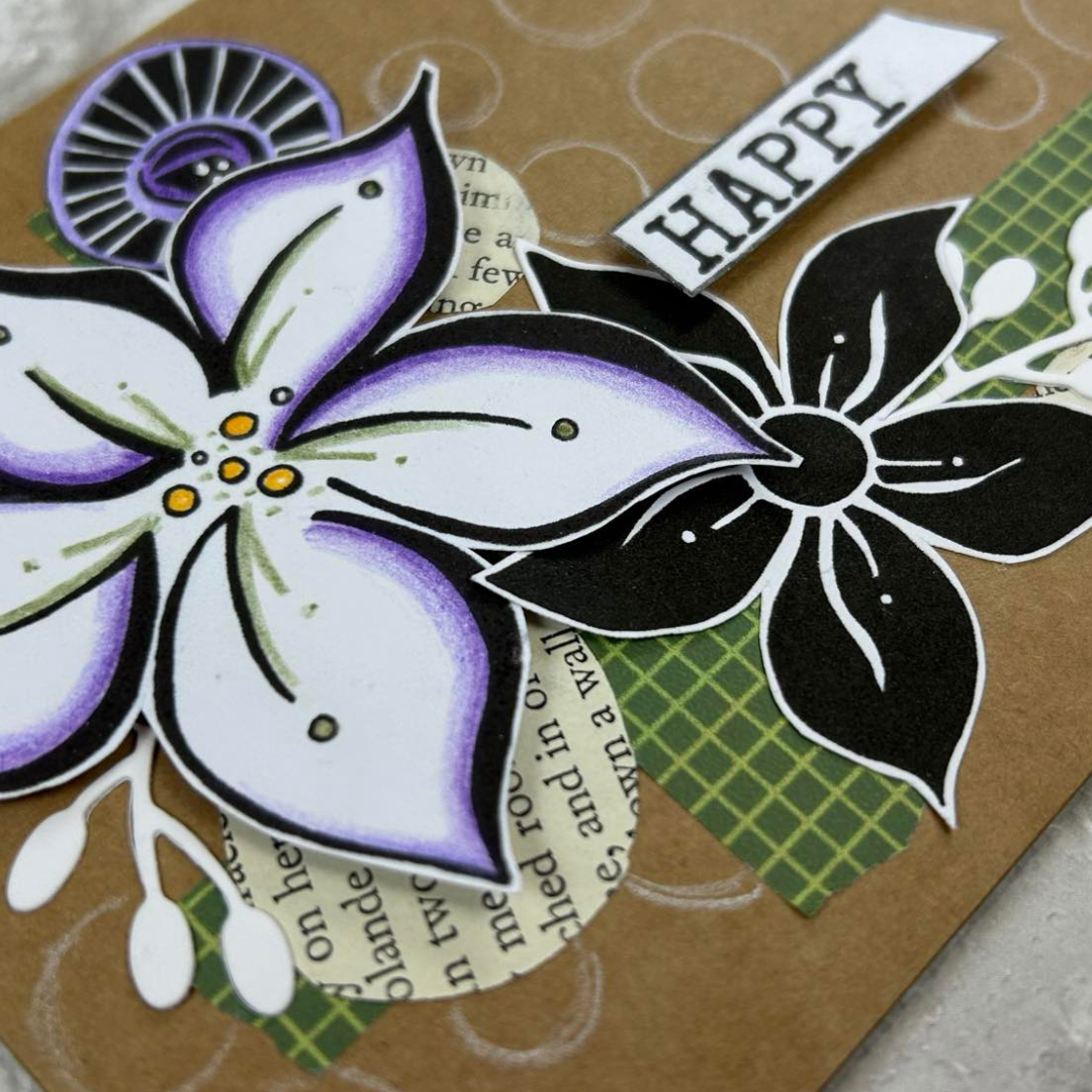 The big bold flowers on JOFY133 have been adapted from doodles in one of my junk journals - so they are a bit wonky and irregular. Previously when I've designed flowers with lines on the petals I have filled the lines in with detail but I have intentionally left these flowers plain. This is so YOU can fill them in with any pattern and colours you would like.