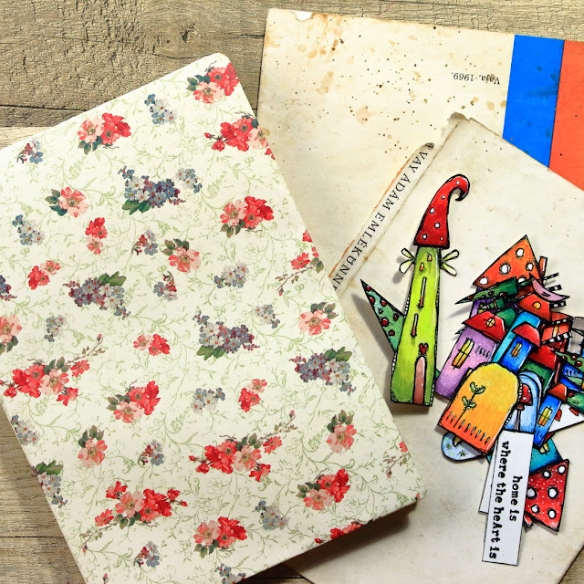 If in the previous section you thought I missed a quote, you guessed right. I decided to stamp a lovely sentiment about home from the KC004 on a book paper. It helped fill all that empty space I had going on, but for some more touch of color, I stamped, colored and adhered a couple of cute little banners in the top right corner.