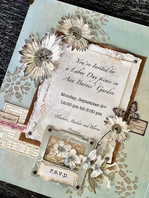embossing Powder from Lindysgang as a base for a delicate vellum text. I also used the postcard stamp on the “r.s.v.p.” slide die cut and added some of my customs flowers.