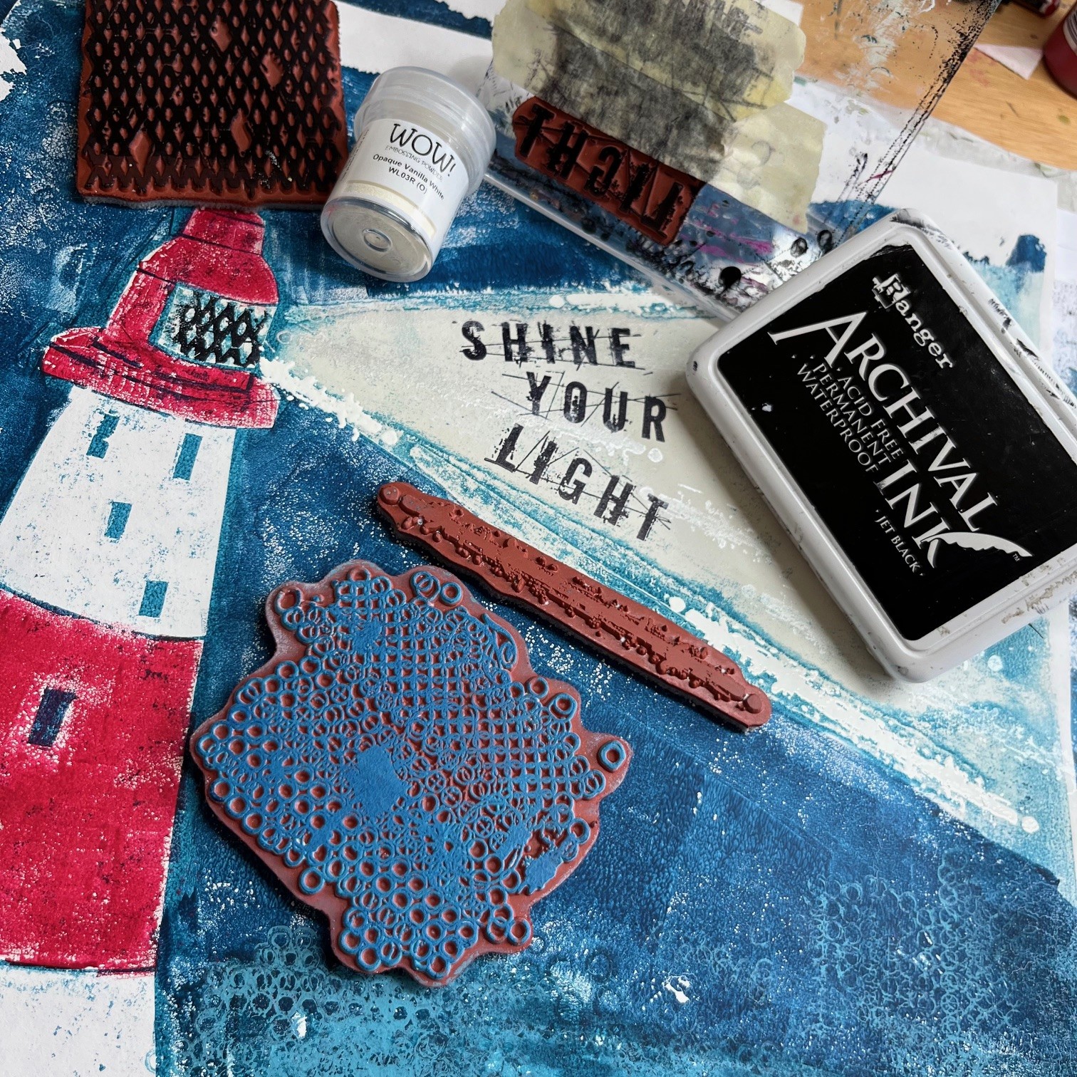 I used a make up sponge to add colour into the smaller areas: I used Heavy Cream for the light ray and Red Lipstick for the parts of the lighthouse body. I stamped some detail onto the gel plate and allowed that to dry.