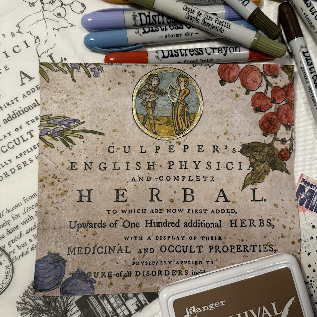 Using Ranger Industries Distress Crayons, and a water brush, I added color to the botanical images and circular seal portion of the printed tissue. to add a bit of grunginess to the panel I stamped PaperArtsy Minis (MN72) with Ranger Industries Archival ink - Coffee. I added bit of Gold leaf pen around the outside edge of the circle and the interior panel was finished.