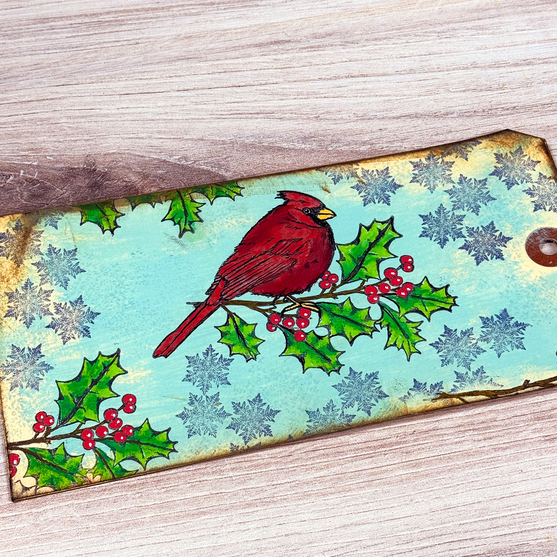 I love to build a scene with a little masking and it's pretty easy to make some quick masks of the birds so you can perch them on the branches. I love how both the bird and holly look when painted and the layered snowflake stamps create a great winter atmosphere.