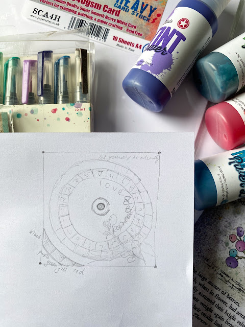 I tried to use most of the accompanying stamps in Alison's set. They added detail beautifully. I used the circular one to ground the central brad. I needed to have a brad to allow both removal of the top section to add another month's blank circles and also to allow shifting, to make it more appealing as the colours were added day by day.