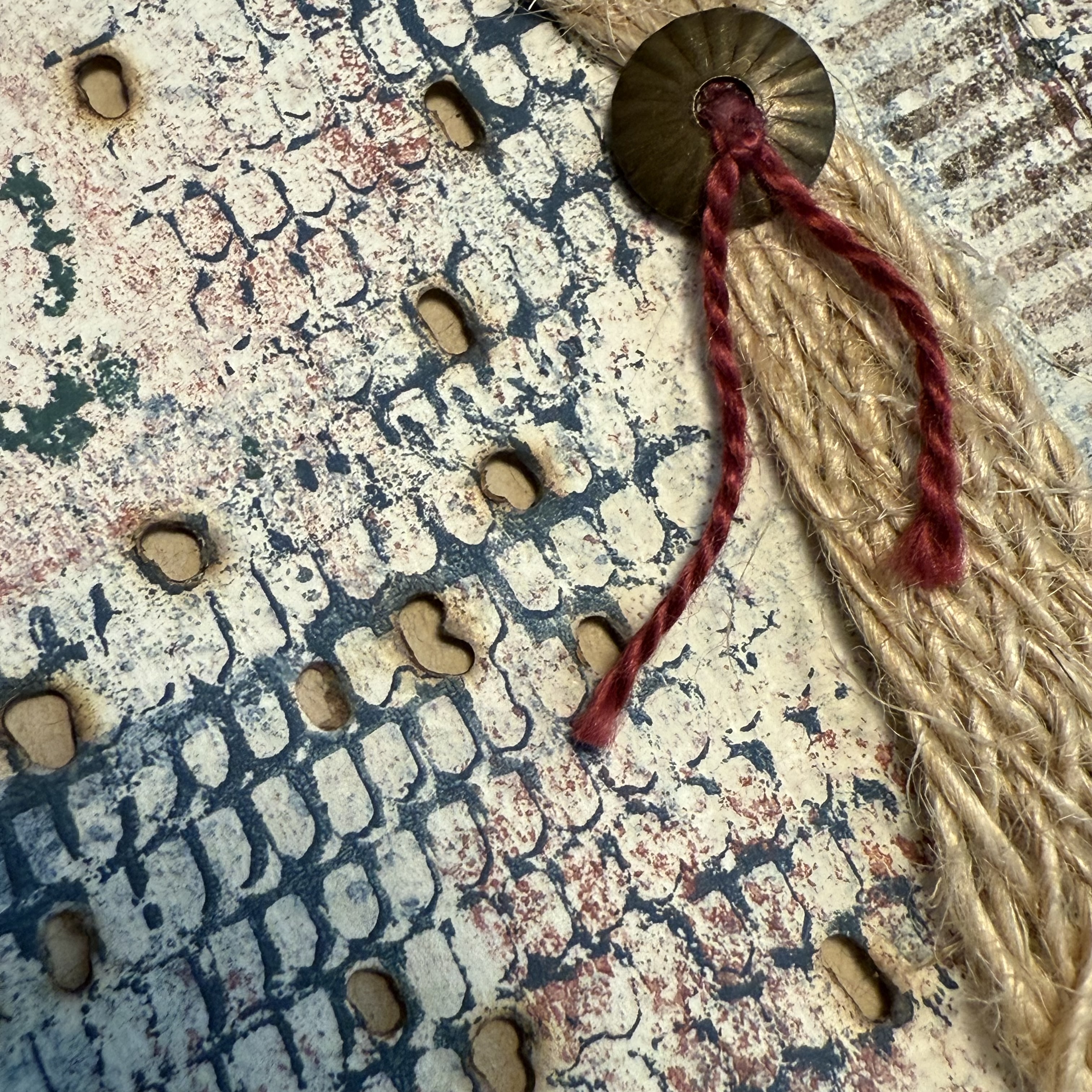 Once you begin to play with the stamps and envision different ways to embellish them, you can grab your favorite go-to supplies. I used some coordinating embroidery thread, some jute and also some weathered gold mixed media embossing powder inspired by Seth Apter for WOW!